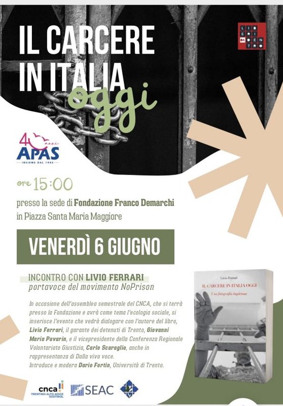 In occasione dell'assemblea nazionale del CNCA che si terrà a Trento, si inserisce l'evento (aperto gratuitamente al pubblico) che vedrà dialogare con l'autore del libro Livio Ferrari (portavoce del movimento no-prison) il garante dei detenuti di Trento Giovanni Maria Pavarin e il vicepresidente della Conferenza Regionale Volontariato Giustizia Carlo Scaraglio. Introduce e modera Dario Fortin del Dipartimento di Psicologia e Scienze Cognitive dell'Università di Trento.